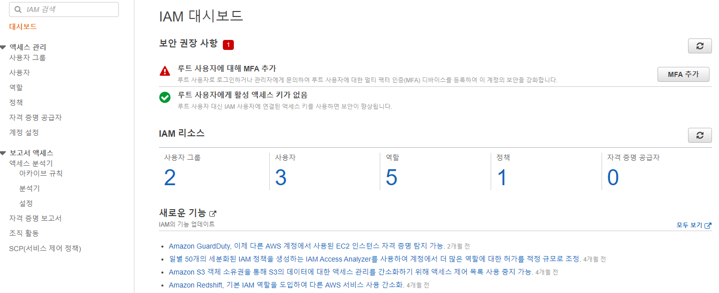 IAM의 대시보드를 보면 5가지의 구성이 있는데요.